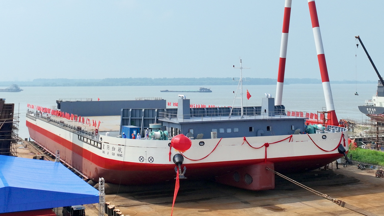 在江苏润扬船业有限公司的舾装码头,一艘长100米、型宽42米的乳白色巨轮静静停泊。甲板中央,一块40米×60米的专用平台空置着,仿佛等待着什么。船体上,“星际归航”四个大字清晰醒目——这是由浙江太和航运有限公司主导设计的中国第一艘专为运载火箭海上回收任务打造的非自航火箭回收船,即将服务星际荣耀中大型可重复使用液体运载火箭“双曲线)的首飞任务。